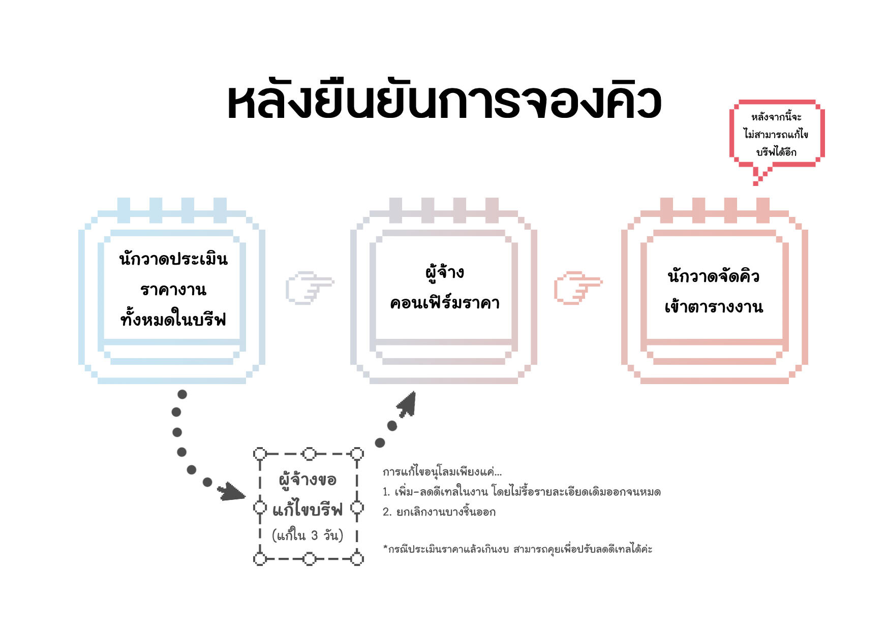 ◆ หากต้องการจองหลายชิ้นงานในคิวเดียว กรุณาเตรียมบรีฟให้พร้อมทุกงานก่อนประเมินราคา